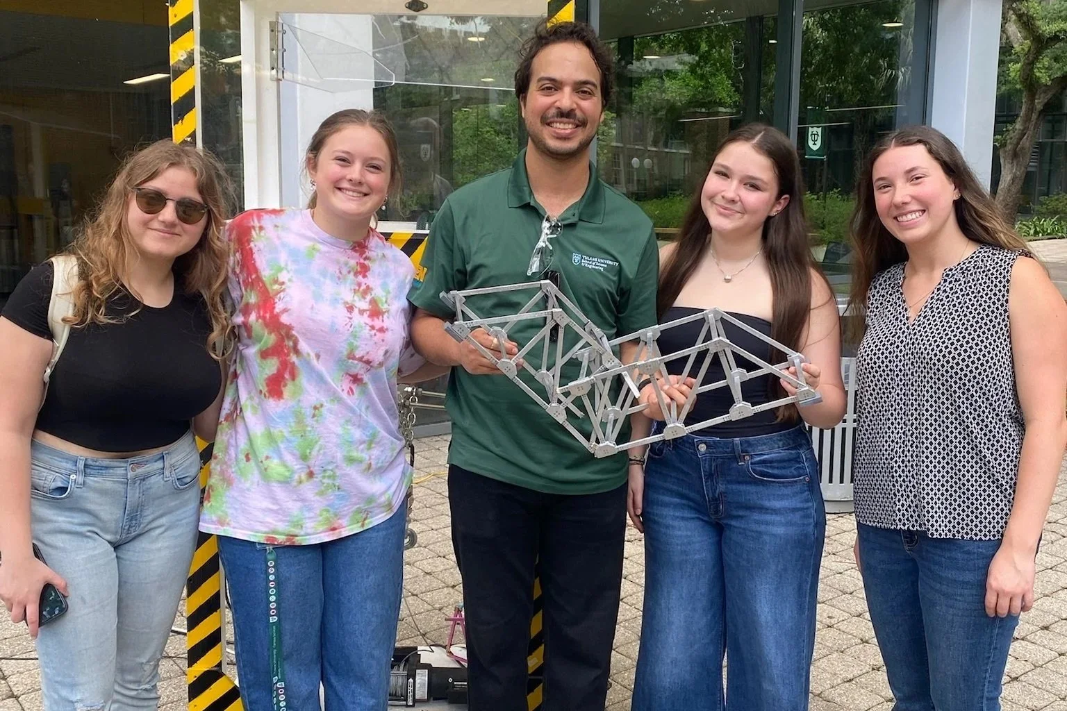 Tulane’s statics class has an end-of-semester project to build a truss of our own design. On the last day of class, we test them all to find breaking points!